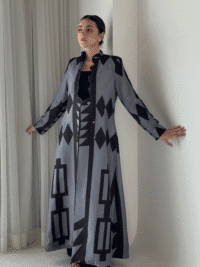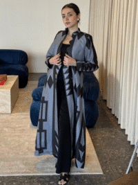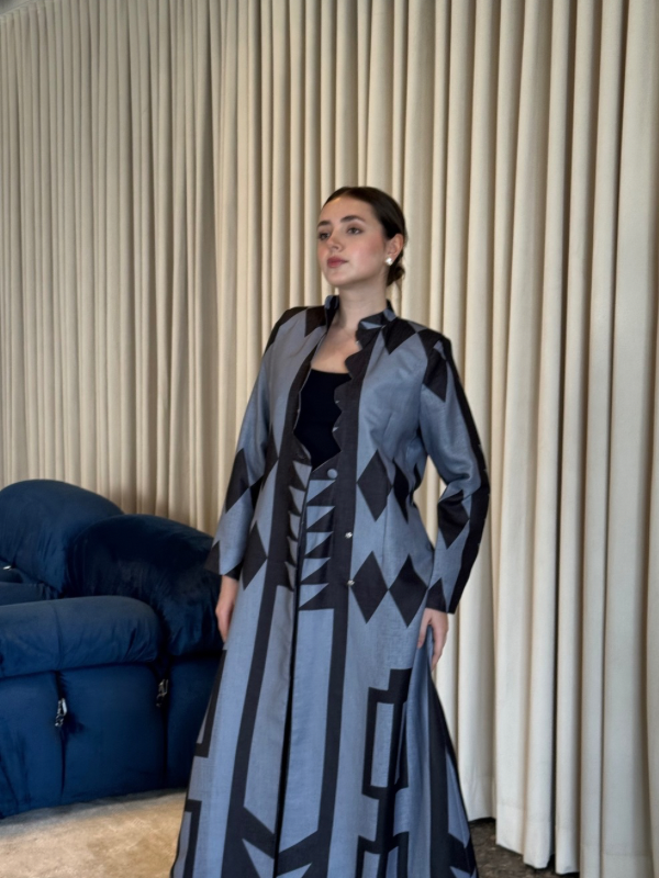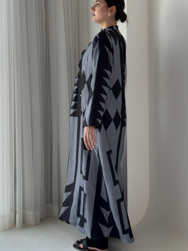 ⁨ بزوايا حادة ونقش جريء، — عباية رمادية بطابع هندسي